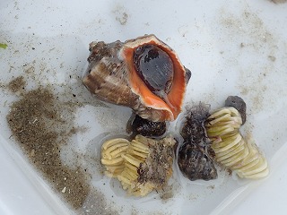 カガミガイ、ウチムラサキ(オオアサリ)、アサリ、マガキ、サルボウ、イボニシ、イシダタミ、ツメタガイ、アカニシ、シマメノウフネガイ