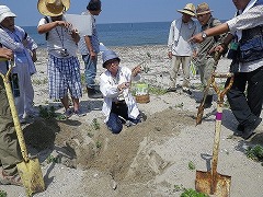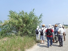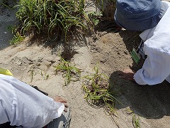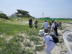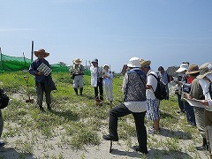空気が乾き、比較的過ごしやすい好天の中、実施されました。夏休みに入って直ぐの平日で子供達は、参加可能ですがほとんどの方の家庭は勤めになっているため、家族参加はほとんどありませんでした。大人の方で海浜植物に興味がある人がたくさん参加をしていただきました。