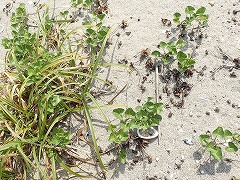 【左】ハマゴウ 【中】ビロウドテンツキ 【右】ハマヒルガオとコウボウムギ