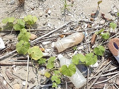 【左】ウチワサボテン(外来)を繁殖させているのでしょうか 【中】漂着したオニグルミから芽 【右】地元の人が植樹した樹木。トベラ、シャリンバイ、ハマヒサカキなど