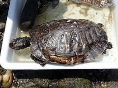 【左】漂着したアカミミガメ(外来) 【中】ヒメケハダヒザラ? 【右】アカニシとその卵
