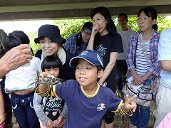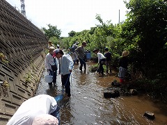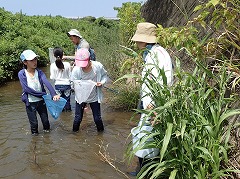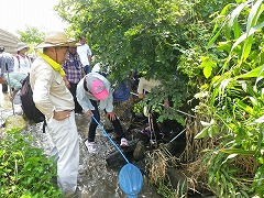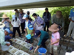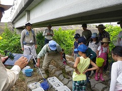 当日は青海市民センターに集合してから徒歩で下手橋まで移動し、橋の下の日陰で簡単なお約束をして川に入りました。それぞれ家族ごとに思い思いの場所でガサガサを行い、採集した獲物を橋の下に持ち寄り生き物の紹介と分かち合いを行いました。題名にあるメダカは確認できませんでしたが珍しいカワアナゴを確認することが出来ました。(記・降幡)