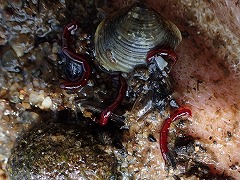 【左】生き物の解説 【中】ベンケイガニを持って得意顔 【右】シジミとユスリカ(アカムシ)