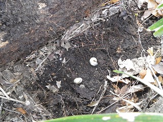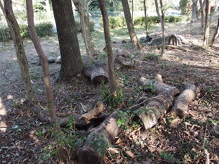 【左】観察会会場 【中】まだまだ朽ちていません 【右】落ち葉は沢山