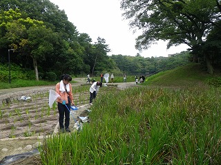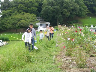 【左】公園Pで開会、諸注意 【右】バラ園周辺の草地でトンボ獲り