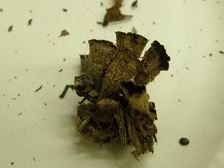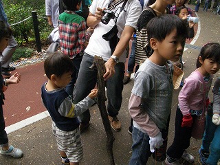 はじめに降幡さんがキノコの生態や観察するポイントについて説明をした。キノコのつくりについて、キノコを拡大した図で説明するので分かりやすく、参加者の小さい子までが、熱心に聞き入っていた。続いて課長さんから公園の諸注意についてお話があった。雨が降らないので、キノコが少ないのではないかと危惧していたが、キノコ探しに入ると、子供の目線は低く、意欲的に次々とキノコを見つけていた。親御さんも童心に返り熱心にキノコ探しをした。長さ10p以上幅5センチ以上もある立派なコウヤクタケ、しっかり幹に付いてなかなか離れないコフキサルノコシカケ、珍しいチャダイゴケの仲間等が見つかった。(記:吉房)