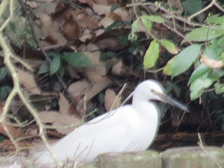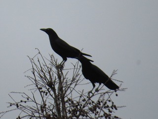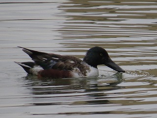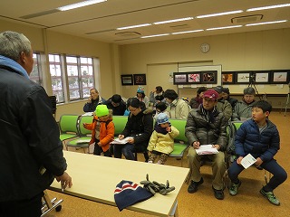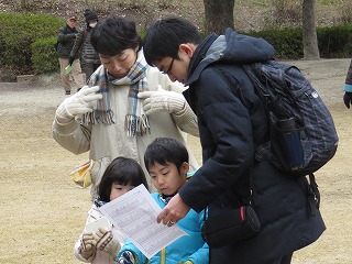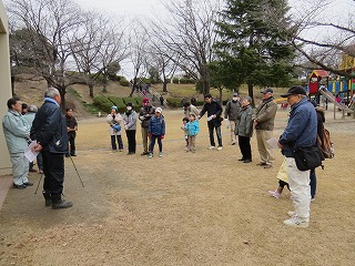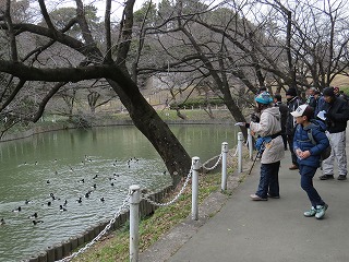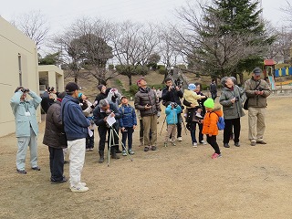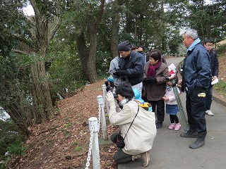 最大級の寒波が来、大変寒い日となりました。この寒さにも負けず15人も(幼児を含む)参加されました。主催者の挨拶のあと、歩きはじめると早々に木のてっぺんに真っ黒な鳥の姿。望遠鏡で見るとカラスでした。皆で交代にのぞくと大きく見えるのに歓声が上がりました。池に出るとキンクロハジロの群れが迎えてくれ、パンの耳をやると争って食べていました。いろいろなカモが見られ、アオサギ・コサギなどが見られ喜ばれました。ガチョウ広場の近くの枝にオシドリが止まっているのを見つけ、きれいな羽をじっくり観察できました。歩道脇の杉の木に穴が空いているのを見つけ、コゲラの話で盛り上がりました。池を一回りして土手まで来ると近くの松にカワセミが居り背中のコバルトブルーがとてもきれいでした。管理事務所の多目的室で冬の鳥写真展を見、まとめをして終わりました。(記・神野)