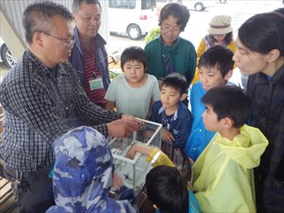 【左】つかまえた場所での説明 【右】ミニ水族館の前での説明。ホーム玄関前
