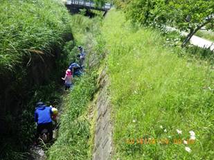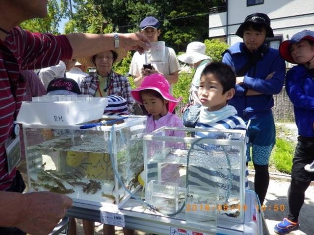 【内 容】前日の豪雨が心配されましたが、水量は安定し、清れいな水が流れており、本日の信濃川自然観察会は楽しい会となる予感をさせてくれました。現地では梯子の降り方、登り方の説明、サポートもしっかり安全に降りる事が出来ました。川に入ると皆さん網の掛け方、足の踏み方らは、リーダーの田中さんに教えられたように、草の茂みの下を盛んに、ジャバジャバと踏み込んで何かが入っているかなと、興味深々、ザリガニ、カワニナ、カダヤシ、ヤゴ・・・・等々、なんか判らんが、小さいけど魚がたくさん捕れました。今日は大漁、大漁の日でありました。終わりに講師の田中さんによる各魚類等の説明が専用のケースを使用して魚の名等由来の説明を受けました。この川でアユが捕れた。説明を聞けば納得しますが、感嘆の声も上がり、良かったです。他に魚類等多数で終了。