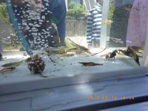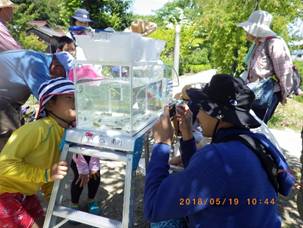 みんなで捕まえた魚たち(川の生き物)をミニ水槽に入れて名前を説明しています。