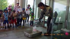 今年も昨年同様の夏の観察会となり、酷暑中での観察会日となり熱中症対策を充分にして実施された。参加者も真夏の暑い日にもかかわらず、タモや虫かごを手に参加された。主催者知多市環境政策課からの挨拶と東邦ガス(株)からは東邦ガス緑浜工場の成り立ちと生産概要と「地球に優しい環境への取り組み活動」の経過をビデオで紹介があり、その後、容器に入ったマイナス160度の液化天然ガスによる実験が行われ、ゴムボールが燃焼して硬化したボールを落下させたり、ガスが燃焼するテストが実施されて、参加者、特に子供たちは驚嘆したり、感激し、液化天然ガスについて学んだ。
