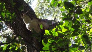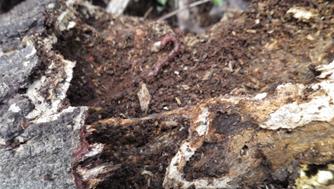 紅葉谷入口にて 高さ4mの枯死木の木くずの中にいたミミズ