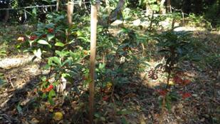 (樹木・草木):イロハモミジ、キズタ、ビナンカズラ、テイカカズラ、ムラサキシキブ、ハゼノキ、カナメモチ、ヒャクリョウ、センリョウ、マンリョウ、クヌギ、マテバシイ、コナラ、スダジイ、クロガネモチ、コウヤボウキ、ツバキ、シキザクラ、スギ、