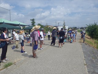 【左】主催者あいさつと指導員のお話 【右】手前が稗田川。向こうが平地川(細くて水面が見えない)
