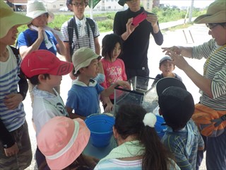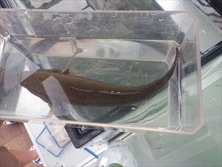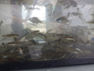 それら獲物を半田ブロック方式(水槽を2ヶ使い、片方に魚類、もう片方に魚類以外)でミニ水族館を設置し、その前で獲物の説明をした。説明を聞く人は15分ぐらいで隣りのミニ水族館に移動。即ち、説明する人は同じことを二度繰り返すという方法。この方法は子どもの数が12,3名以上からは子どもにとって大変有効な方法である。