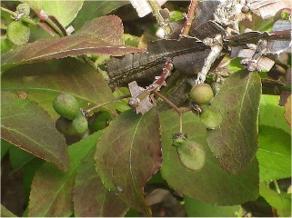 【左】ネズ。昨今、珍しい木 【中・右】ニシキギの果実。見たのは初めてのような気がする