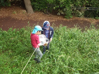 【左】始めのあいさつとお話  【右】子どもはバッタがいれば大喜び。でも、余りいなかった
