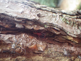 【左】虫たちがケンカしないよう工夫して入れる   【中】松の皮の割れ目にヨコヅナサシガメ
