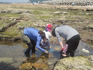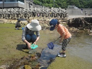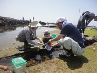 今回の観察会についても、まとめで生き物の名前を一つ一つ説明をするのはやめました。その分、どんな場所にどんな生き物が生息しているのかを知るなどして、磯の生き物に親しむ時間を大切にしました。また、素手で触っても大丈夫な生き物については、どんどん子どもたちに素手で触ってもらいます。名前については、採集時に、近くの指導員に聞いたりすることは、当然、ありです。