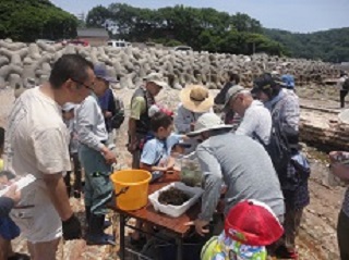 今回で4回目となるアオウミウシを見つけようが晴天のなか開催されました。県水産試験場駐車場から峠海岸までの道のりは、徒歩で漁港内の生き物を観察しながら進みました。