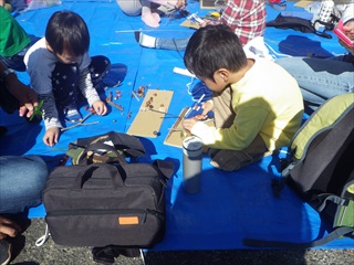 工作材料は、観察会側が用意したドングリ各種、クルミ、松ボックリ、ツバキ、ムクロジ、モミジバフウ等に加え、工作の前に自然公園を散策して集めたツバキの実やヤツデ、アジサイ、モミジなどの葉も加わって、たくさんの種類の材料が揃いました。