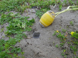【左】小雨に煙る蒲池海岸 【右】小雨の下、コマツヨイグサが蛍光色で目立つ