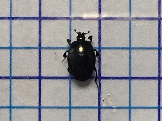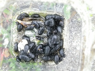 【左】昆虫採集トラップと目印 【右】大量に捕れたスナゴミムシダマシの仲間