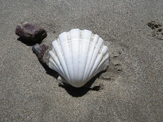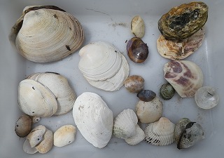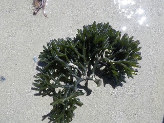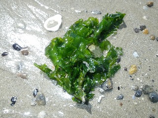 【左】漂着海藻 ミル 【中】漂着海藻 アナアオサ 【右】イタヤガイ(貝殻)