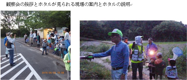 今年は佐布里ダムの堤防工事でいつもの観察路は歩けなかったが、子供たちは懐中電池を手にする機会が少ないのか楽しそうに田圃の畔等で観察しながら、目的地の林の湿地を観察すると僅かながらホタルが草陰や木の葉中から少しずつピカピカとホタルが光りだした。子供たちは「光っているよ、飛んでいるよ」とはしゃぎながら、ホタルの光る姿を観察した。