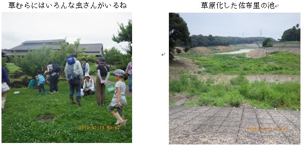 草むらの中でみんな,手つかみで、カナヘビ、カエル、ミシシッピーアカミミガメ(5〜6cm),バッター等を夢中で捕っては、あちら、こちらで子供たちの歓声が上がり楽しんでいた、賑やかな観察会であった。  (記:藤井辰子)