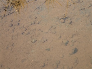 【左】観察コースの一部 【中】小さな浅い池にタニシ 【右】ワラビの出始め。?マーク