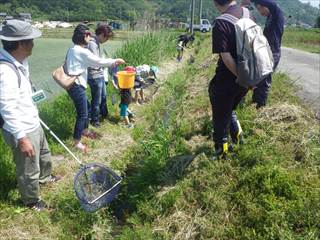 晴天で暑い日となりましたが、子どもたちは元気いっぱいで魚を取ると張り切っていました。集合場所の旧山海小学校からは徒歩で田んぼ周辺の自然の観察、また、周辺の用水路で生き物を捕獲しながら山海川まで進みました。用水路ではたくさんのカダヤシを取ることができました。ダルマガエルやタニシも観察することができました。
