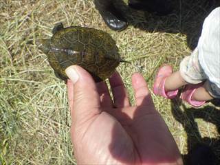 【左】イシガメ  【中】説明終了後にお魚と触れ合う  【右】側溝の壁に羽化したてのトンボに出会う(昼頃の時間帯)