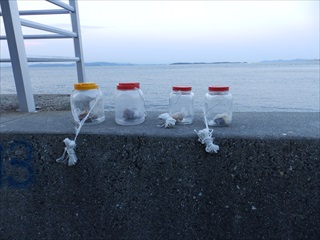 ブタ生レバー、イワシ、チクワなどのエサを入れた捕獲ビン4つを用意し、暗くなる前に海底が砂地の海中に沈め30分ほど待ちます。