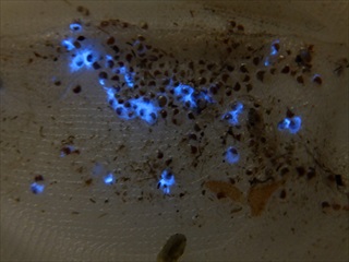 捕獲ビンを海中に入れ、30分ほど経過したあと引き上げると、一見ミジンコの様なウミホタルが捕獲ビンに入っていることが分かりましたが、比較的小型が多かったようです。ウミホタルの発光を見るためには刺激が必要なため、ウミホタルの入ったバケツからウミホタルをアミですくい刺激を与えると、真っ暗な中でウミホタルが青白く光りました。その青白く光る様子に多数の参加者からは歓声が上がっていましたが、見ていただくのに時間がかかりました。今回も夜間にかかわらずケガをする人はなく、無事に観察会は終了しました。