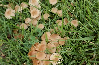 【左】シバフタケ群生 【中】スイバの葉を食べるハグロハバチ(幼虫) 【右】蟻に捕まった甲虫