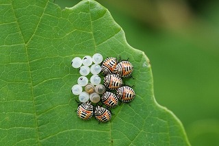【左】ノコギリクワガタ 【中】急いで虫かごへ 【右】キマダラカメムシ 卵と一齢幼虫