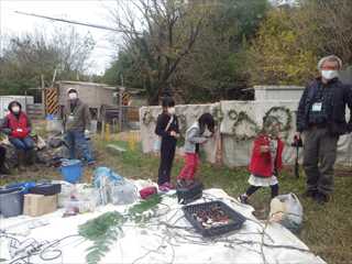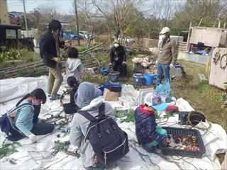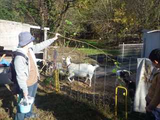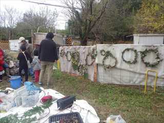 その後、竹林を出てリース作り。初めホットボンドの温度がなかなか上がらない、できたリースをヤギの柵にかけておいたら一部食べられるなどのトラブルがありましたが、皆さん、ひとまずリースは完成しました。