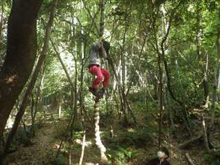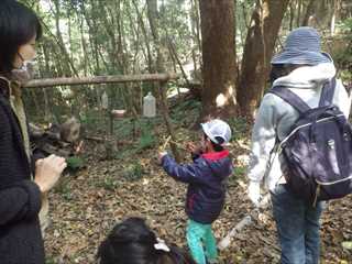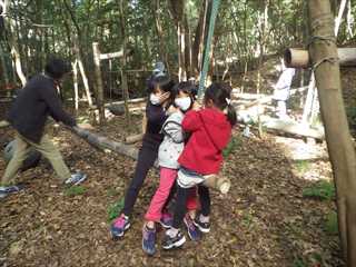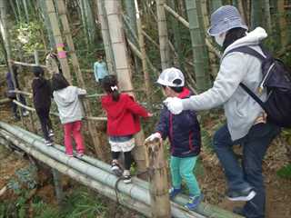 子供たちは、まずヤギを見学。そして竹林の中へ出発。竹で作ったシーソーやブランコなどの遊具を楽しみ、短い竹林トレイルを一周しました。恒例のパチンコや蔦登りにも挑戦。