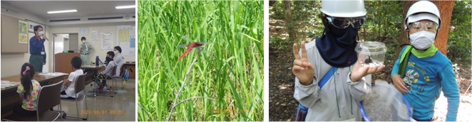 【左】はじめの挨拶 【中】ショウジョウトンボ 【右】カブトムシをゲットしたよ・・