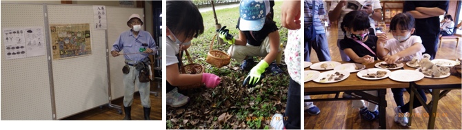 【左】キノコについての説明 【中】アラゲカワラタケを観察 【右】採れたキノコを展示して説明