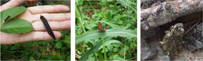 【左】セスジスズメの幼虫(今年は蛹で春を待つのかな?)【中】休憩中のベニシジミ【右】冬眠準備?のアマガエル