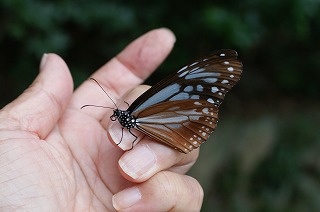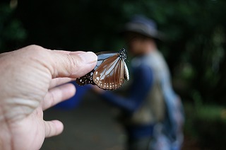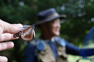 【左】アサギマダラ捕獲 !! 【右】アサギマダラと採集名人