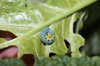 【左】チョウセンカマキリ 【中】ノイエバエ 【右】ハグロハバチ(幼虫) 、食草(ギシギシ)