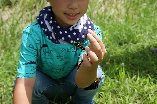 【左】草地で昆虫採集 【中】捕れた虫たちの分かち合い 【右】捕れた虫たちの分かち合い
