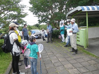【左】コロナ対策 受付 【中】危険な生きもの諸注意 【右】草地で昆虫採集