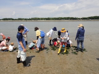 参加者の皆さんは潮が見る見るうちに引いていく中での海辺の生き物探し、アサリにも興味津々で砂堀りや岩陰探しを楽しんでいました。また、指導員が参加者の子供たちと一緒に四手網の操作と魚などの追い込みを行い、上げた四手網の中の魚に歓声を上げていました。