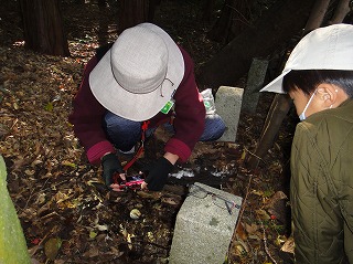 【左】かぶとむし幼虫の糞塚 【中】手水池の言い伝え 【右】谷葉紅 案内