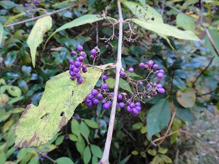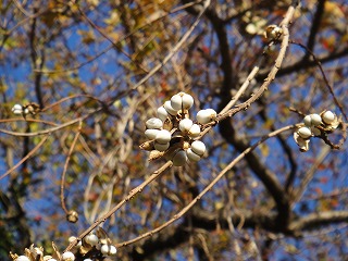 【左】イチョウ 黄葉 【中】コムラサキシキブ 果実 【右】ヤブニッケイ 虫こぶ