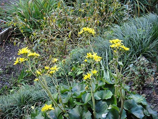 【左】鋸歯の見本(カナメモチの葉) 【中】カナメモチの果実 【右】ツワブキ 開花